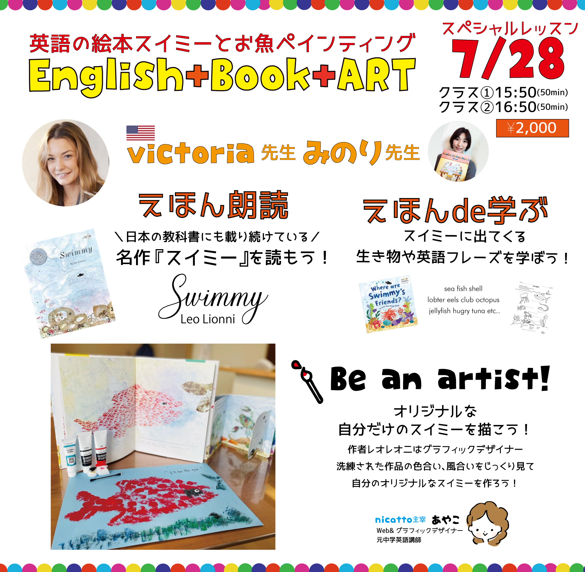 nicattoももともと月1回でネイティブ講師か来て絵本を軸に楽しく学んでいたので、原点となるようなクラスですね。ただ1回のイベントとなると学びにはどうしてもならないので、学びとなる内容も入れていきます。日本人講師がサポートでみのり先生が入っていただけますのでご安心くださいませ。😌