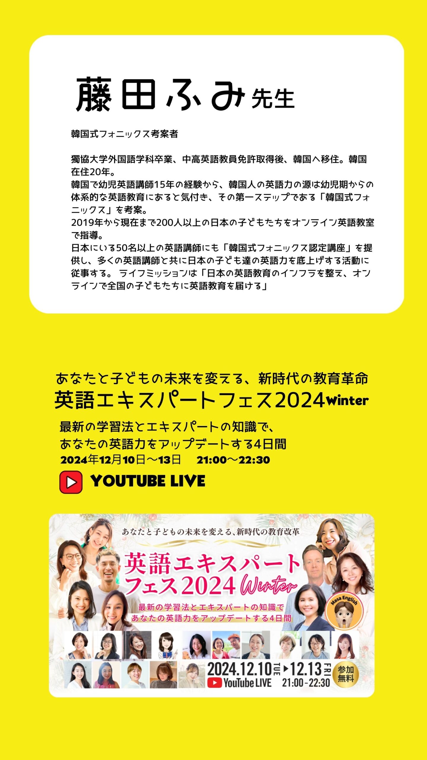 ふみ先生は、 1000人以上が視聴する英語エキスパートフェス を主催し、韓国式フォニックスの考案者としても英語教育の最前線でご活躍中✨
