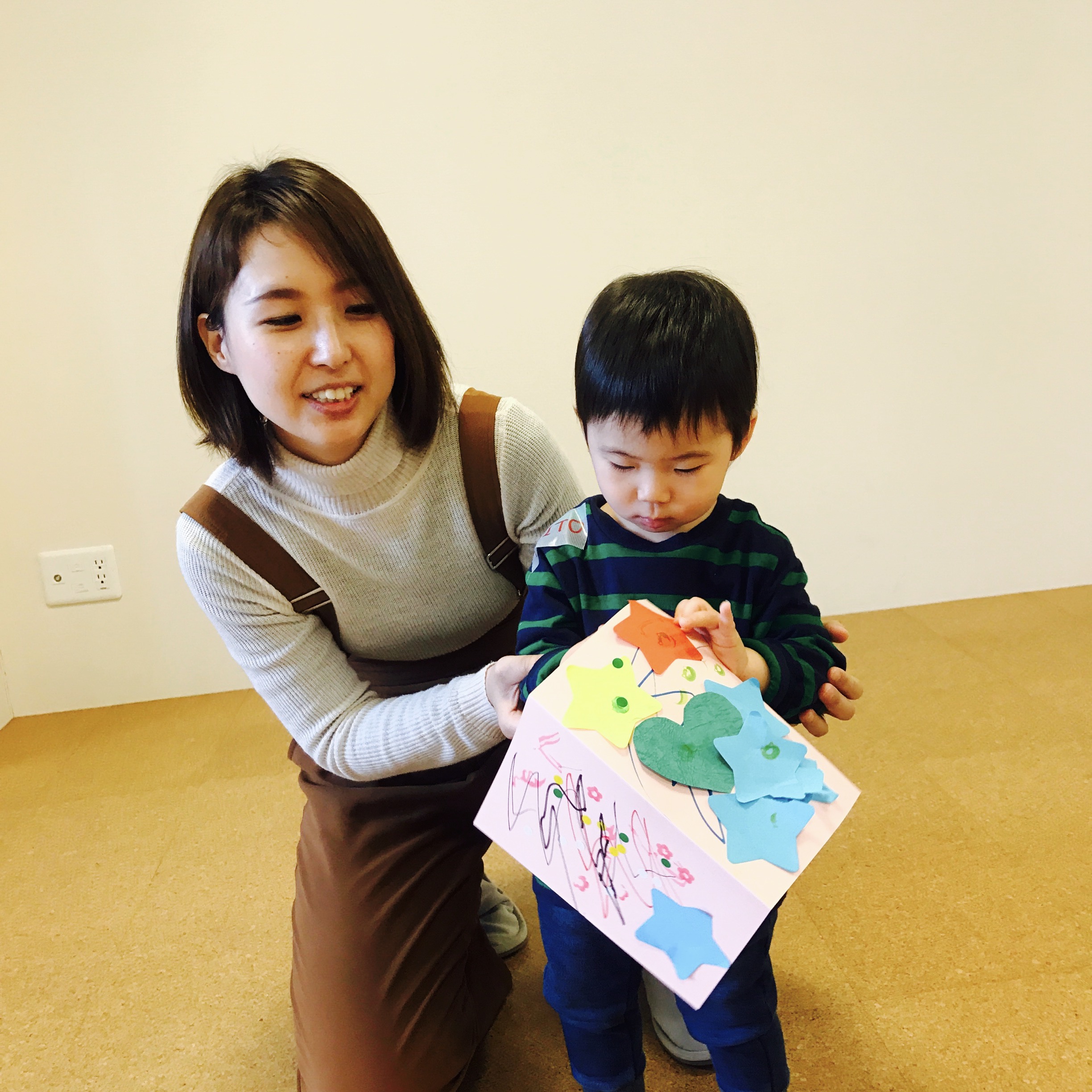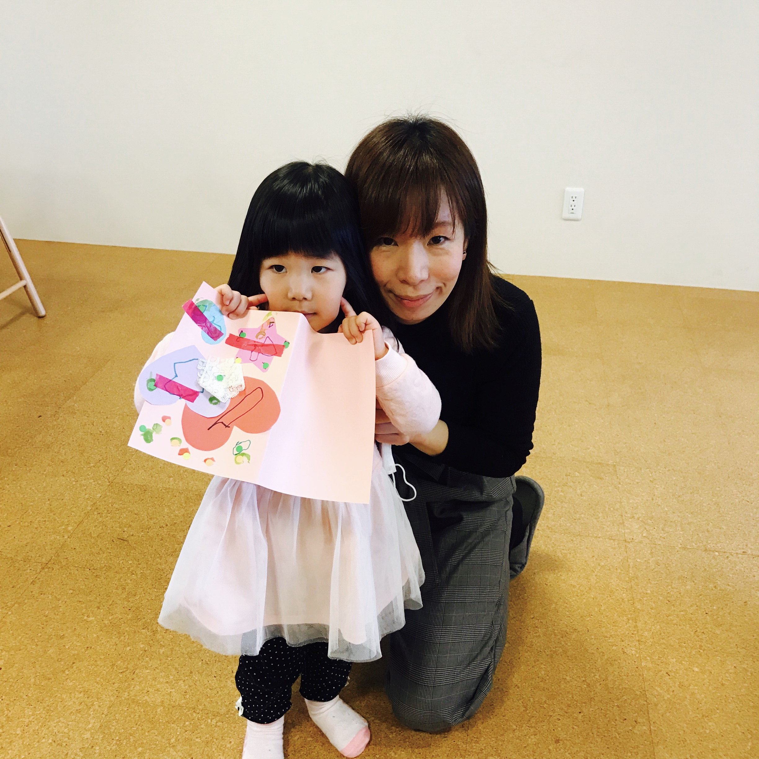 子供たちは自分の好きな色、形の紙をペタペタ、♡をかいたり、スタンプを押したり、ママといっしょに可愛いカードを作ってくださいました。