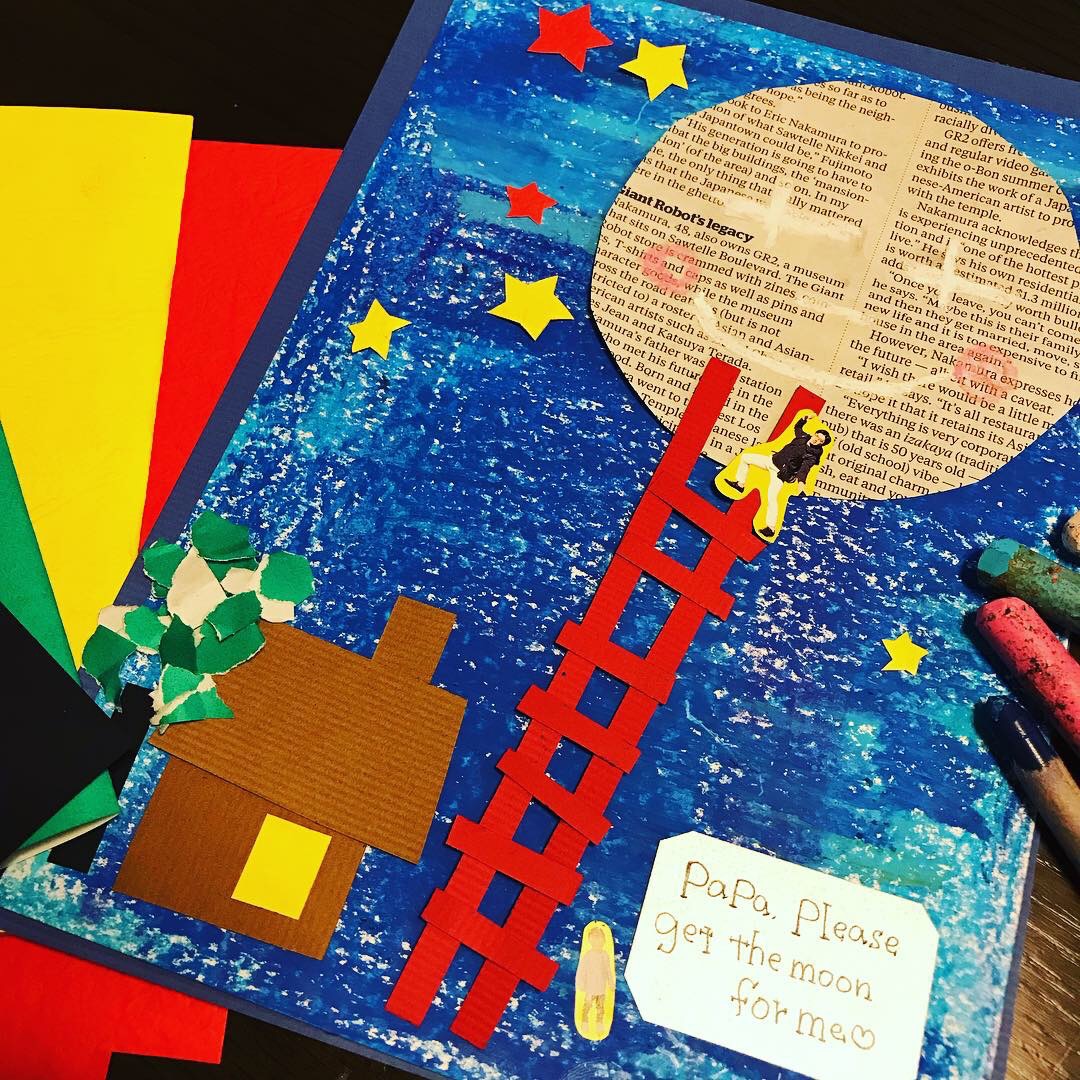クラフトは、英字新聞と、クレヨンと、写真を使ったお月さまコラージュクラフトです。