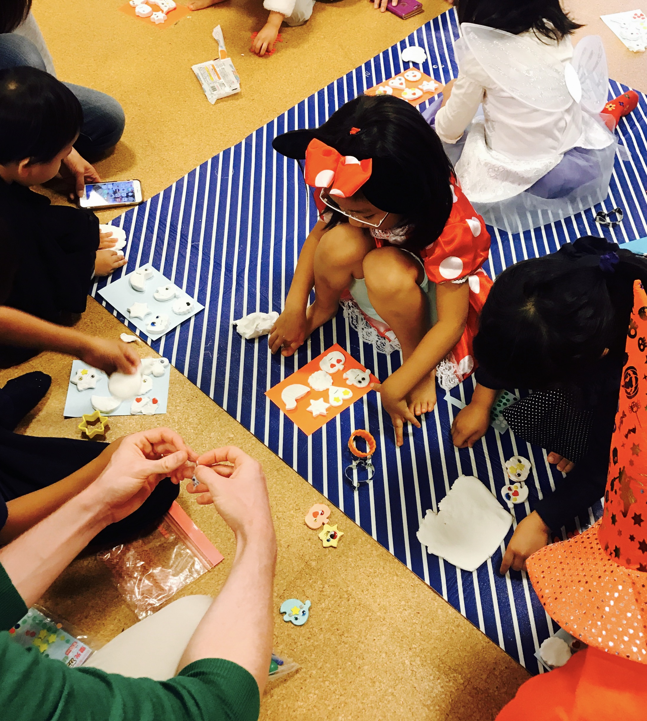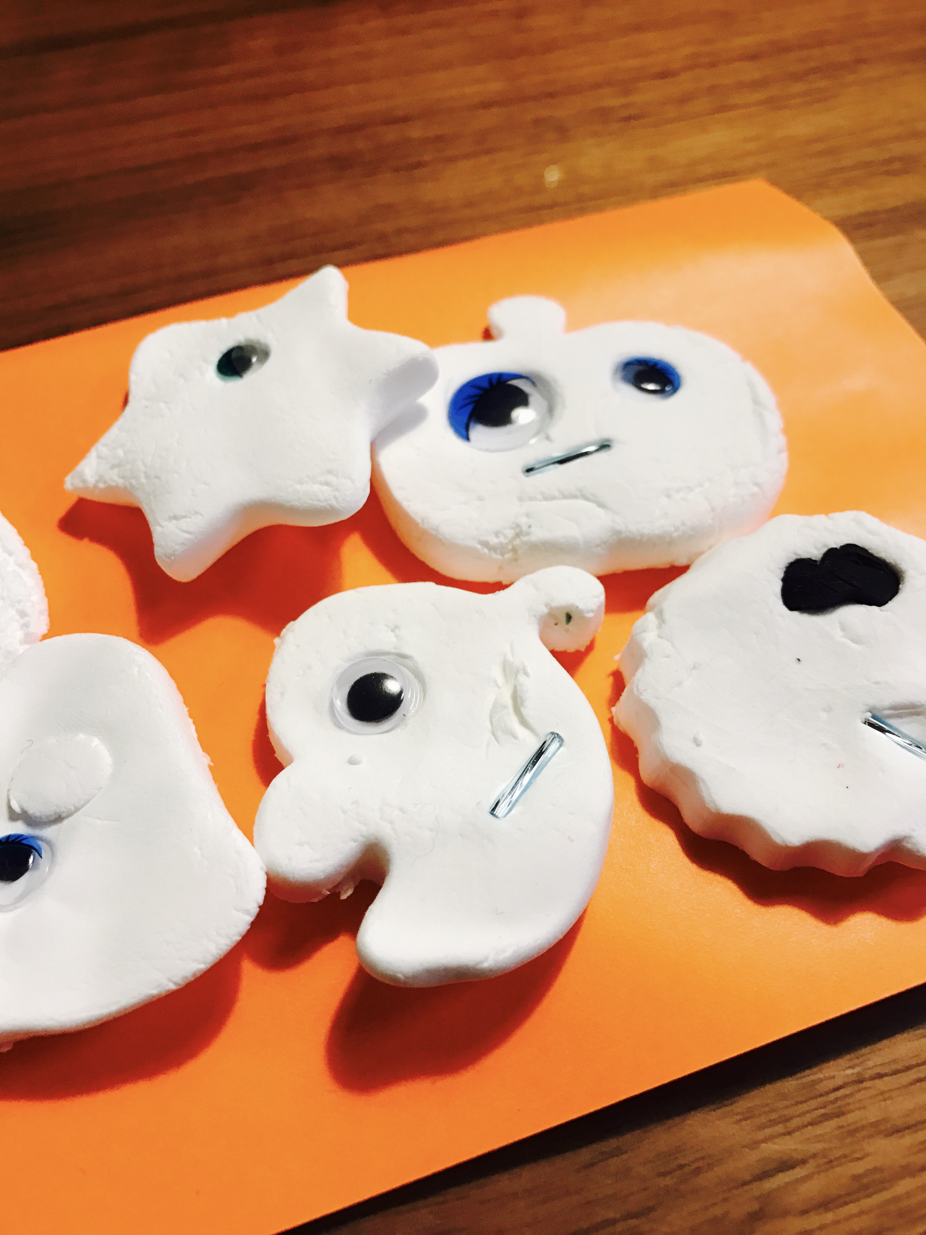 作るのが大好きな子供たち。真剣です!!!!! 目をつけたり、ビーズやシールで装飾してオリジナルおばけを作りました。