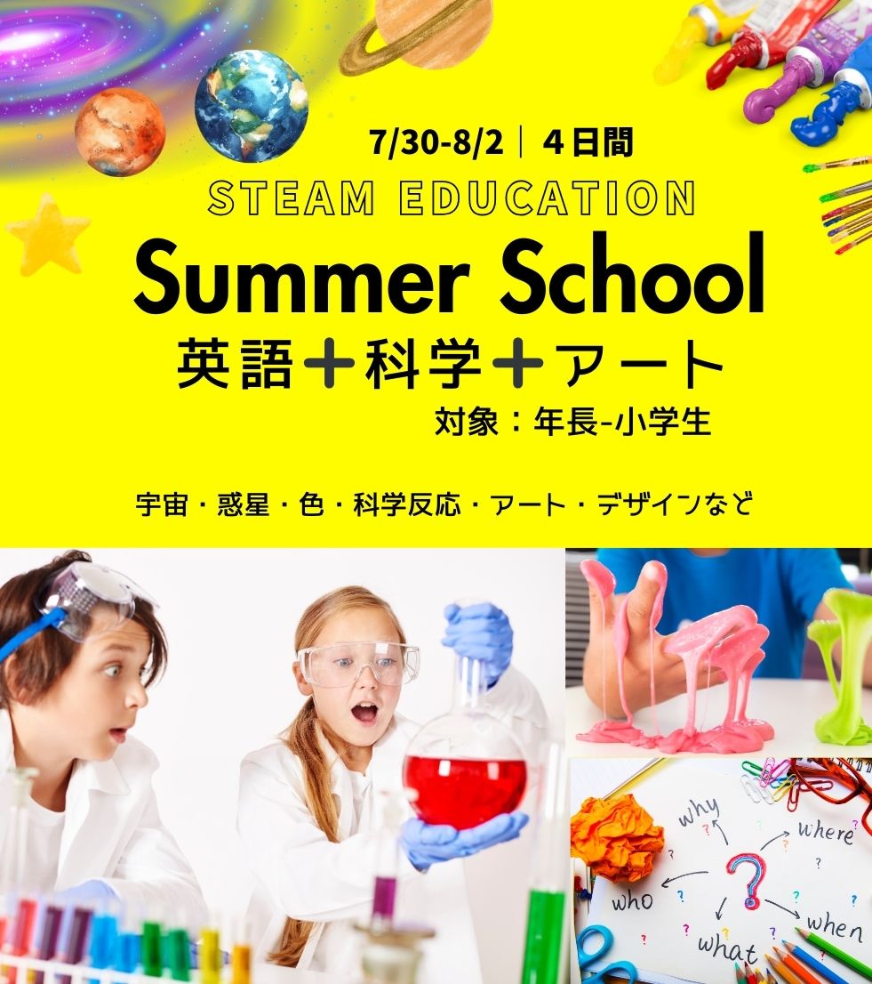 Nicatto+(二カットプラス)サマースクールでは、通常の英語を学ぶと言うコンセプトに➕して近年の文部省でも教育目標とされているSTEAM 教育の中の科学とアートを中心に子供たちの興味の種まきをする内容となっております。